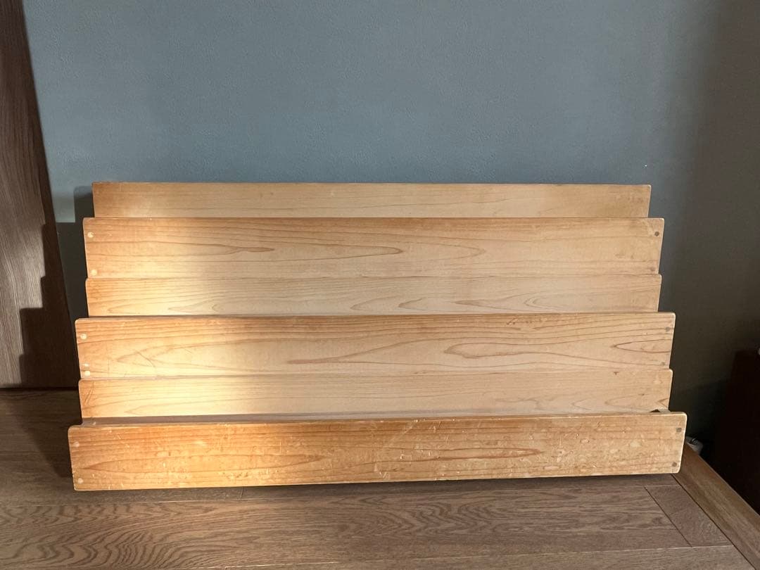 イクススブックスタンドikususuW580 D185 H3001年ほど机の上に乗せていただけなのでキレイだと思います。プチプチにくるんでの発送になります。あったかい、アルダー材の良い感じです。しきりは動かせます。アルダー無垢材を使用した、木製の卓上ブックスタンド。小ぶりなサイズのブックスタンドで、ブックエンドなどとは違い、本を上に置いて商品自体で独立します。文庫本やペーパーバック、CDやDVDケースなどを置くのにちょうどよいサイズ感。デスクの上に置いても良いですし、キャビネットやサイドテーブルの上に置いても。無垢の木を使った直線のラインが際立つシンプルなデザインで、オイルフィニッシュがナチュラルであたたかな印象。実用的で味気なくなりがちな卓上などを、華やかに彩ります。仕切りも同じ木材でつくりました。可動で、しっかりと固定できるので、本が倒れる心配もありません。アクタスシェルフ無印ナチュラルシャビー雑貨キャトルセゾンアフタヌーンティー古道具シャビーキャビネガラスケースパンケース棚イギリスフランス